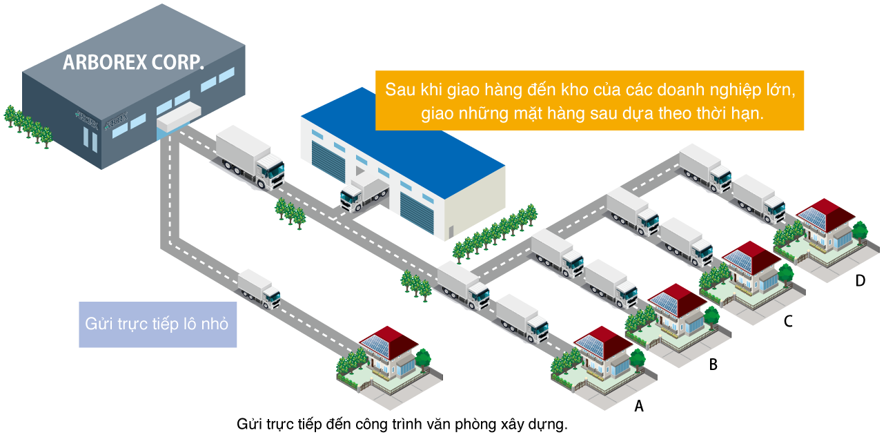 Phương châm của ARBOREX là cung cấp các sản phẩm cho khách hàng dựa trên chất lượng đã được tiến hànhkiểm soát kỹ lưỡng. Ngoài việc quản lý đầy đủ thông tin từ nhận đơn đặt hàng đến tình trạng hàng tồn kho và ngày giao hàng, chúng tôi hướng đến việc giao hàng ngắn nhất, chính xác và chi tiết nhất trong hoạt động vận chuyển.